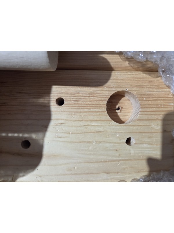 Es sind sichtbare Gebrauchsspuren (optisch) und einige Schraubenspuren an den Latten vorhanden – da der Beutel mit den Schrauben beim Transport beschädigt wurde.