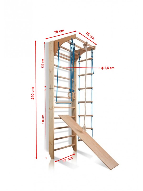 - Belastbarkeit: Leiter bis 150 kg | Obere bewegliche Stange bis 80 kg | Abnehmbare Kinderdreiecksstange bis 50 kg | Hängende Elemente an Seilen bis 60 kg